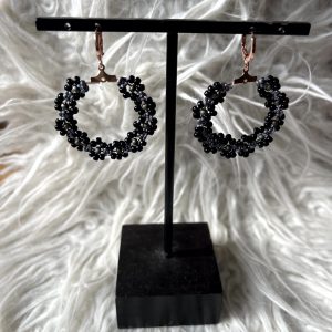Oorbellen rond Ø 4cm met bloemetjes van kleine kraaltjes “zwart”